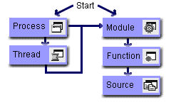Use the toolbar to switch between Process, Thread, Module, Function, and Source views. |